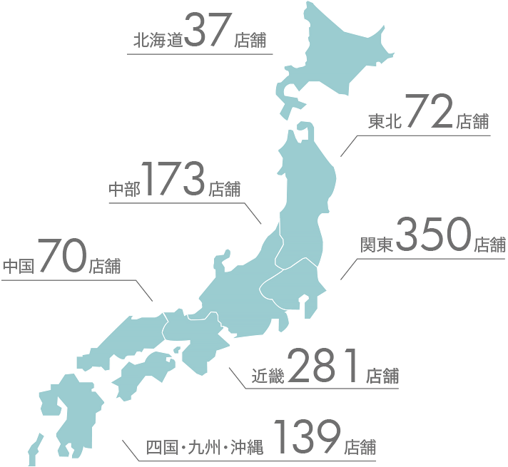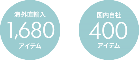 北海道から沖縄まで全国1,122店舗を展開。海外直輸入品は約1,680アイテム、国内の自社製品は約400アイテムがそろっています。
