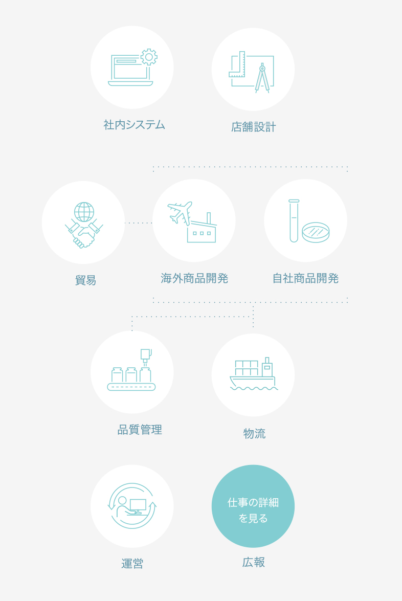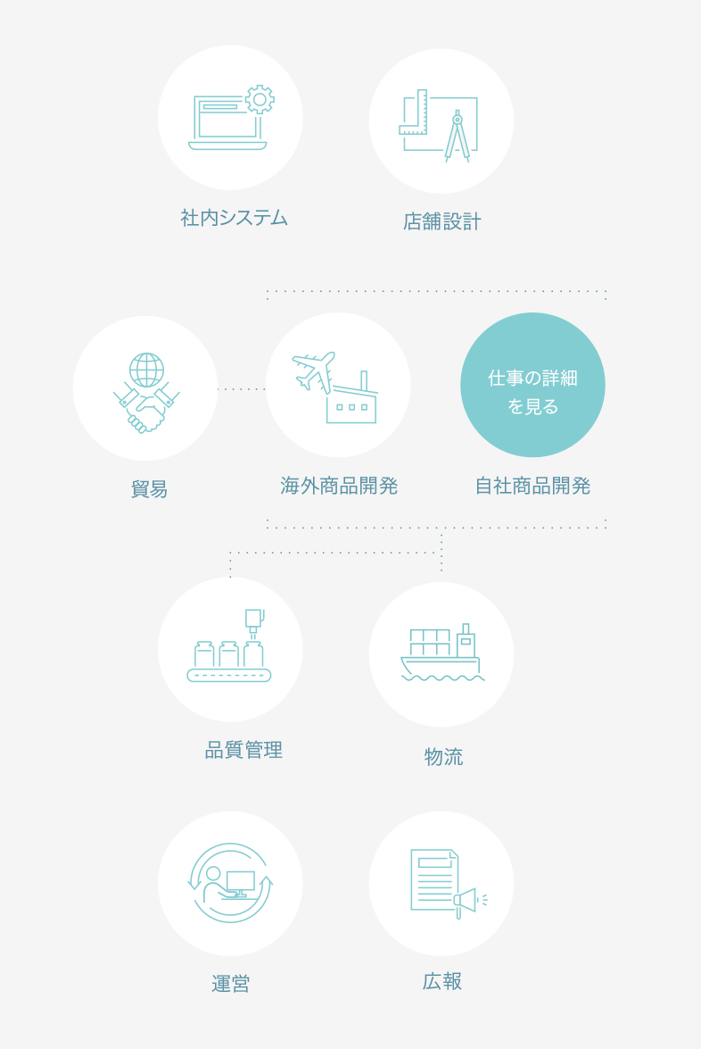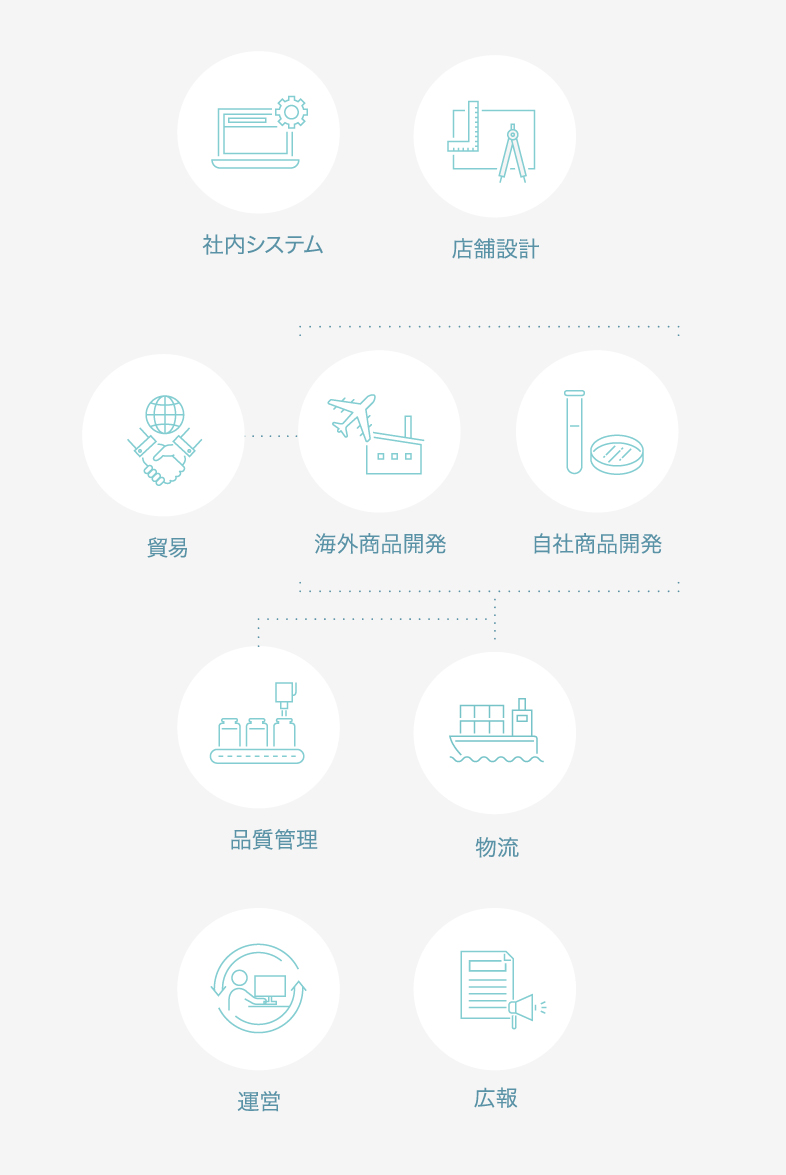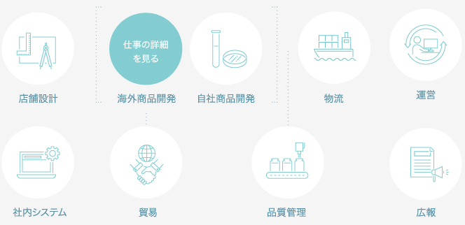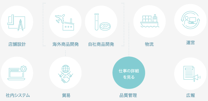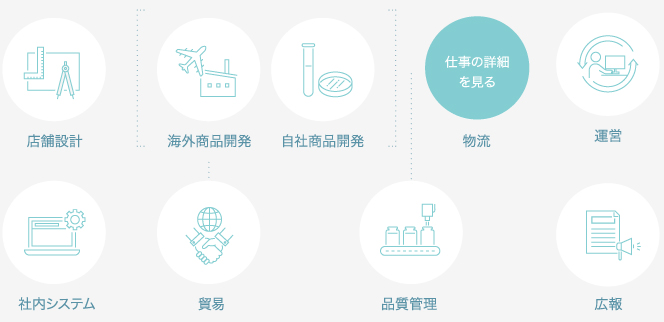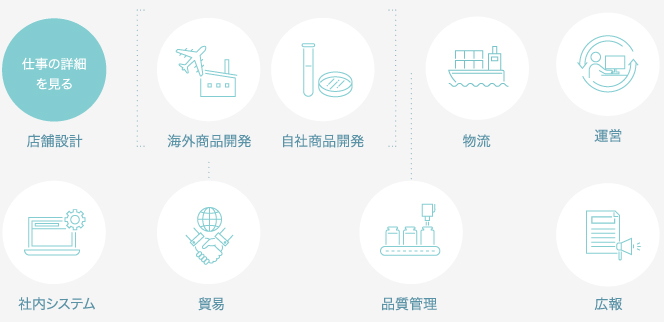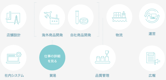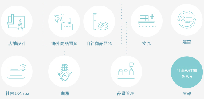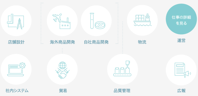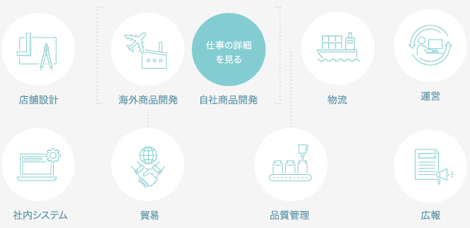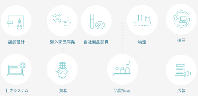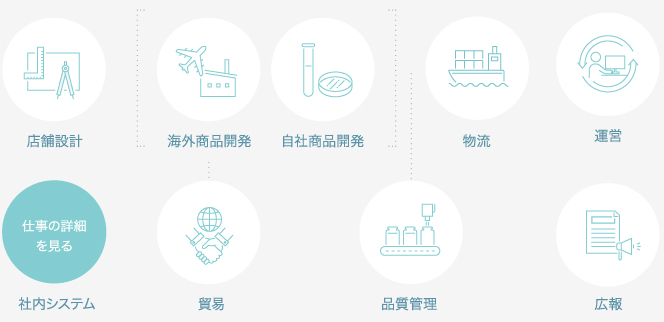 店舗設計、商品開発、物流、運営、広報と、すべての工程を自社で完結できるシステムを整備。各部署が連携し、お客さまに満足いただける品質と価格で商品を提供しています。