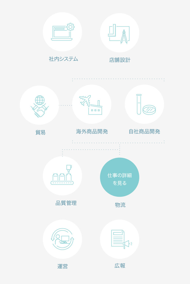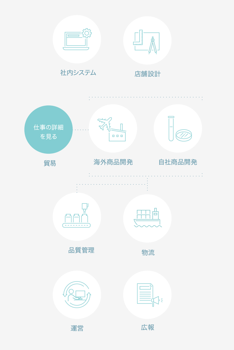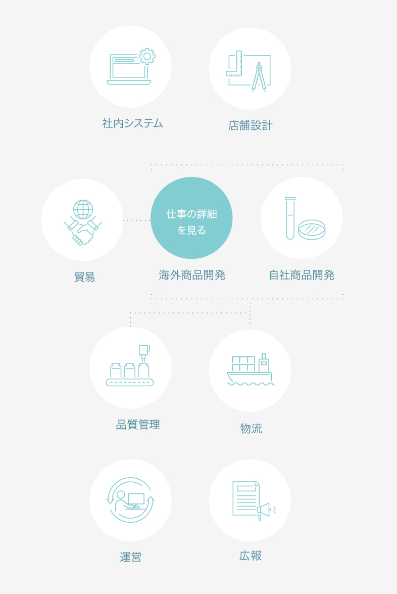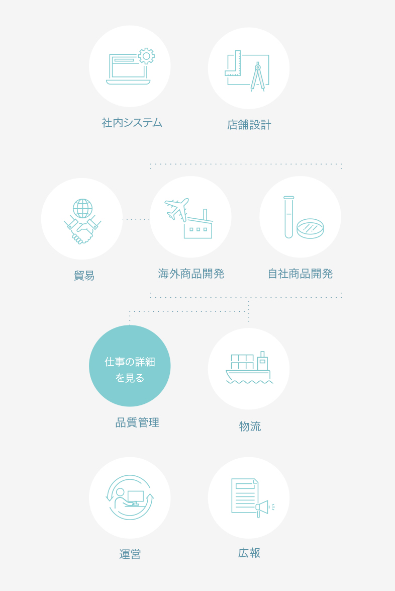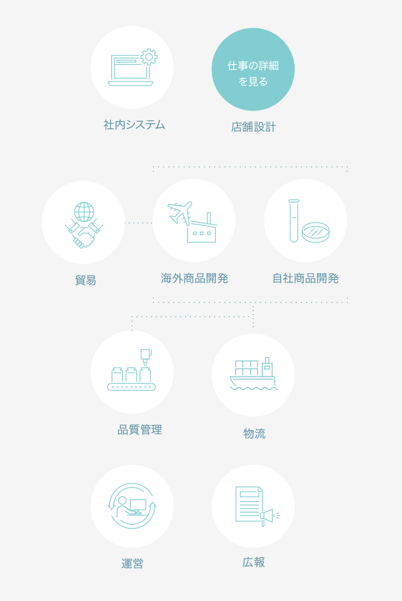 店舗設計、商品開発、物流、運営、広報と、すべての工程を自社で完結できるシステムを整備。各部署が連携し、お客さまに満足いただける品質と価格で商品を提供しています。