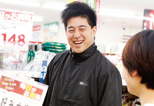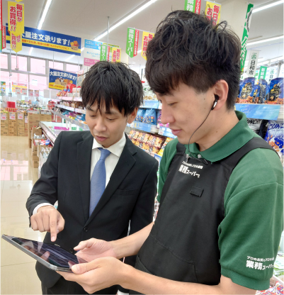 業務スーパーの新規出店や店舗指導、接客や店舗環境の改善へ向けた取り組みをしています。フランチャイズ本部の窓口として、お客さまのニーズや店舗の要望を把握し、パイプ役を担うことも。国内メーカーから約5,000アイテムの仕入れに関わるほか、世界の原料相場や気候の変動、競合スーパーのチラシのチェックをはじめとする情報収集も欠かせません。